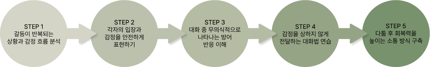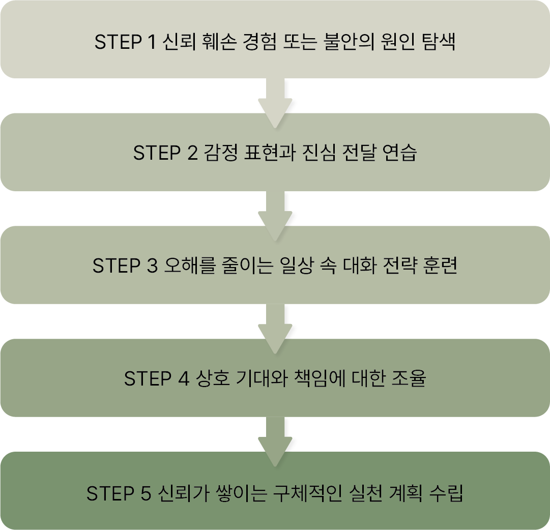 감정과 욕구를 건강하게 표현하는 방법을 익히고 서로 만족할 수 있는 관계 방식으로 정착시킵니다.